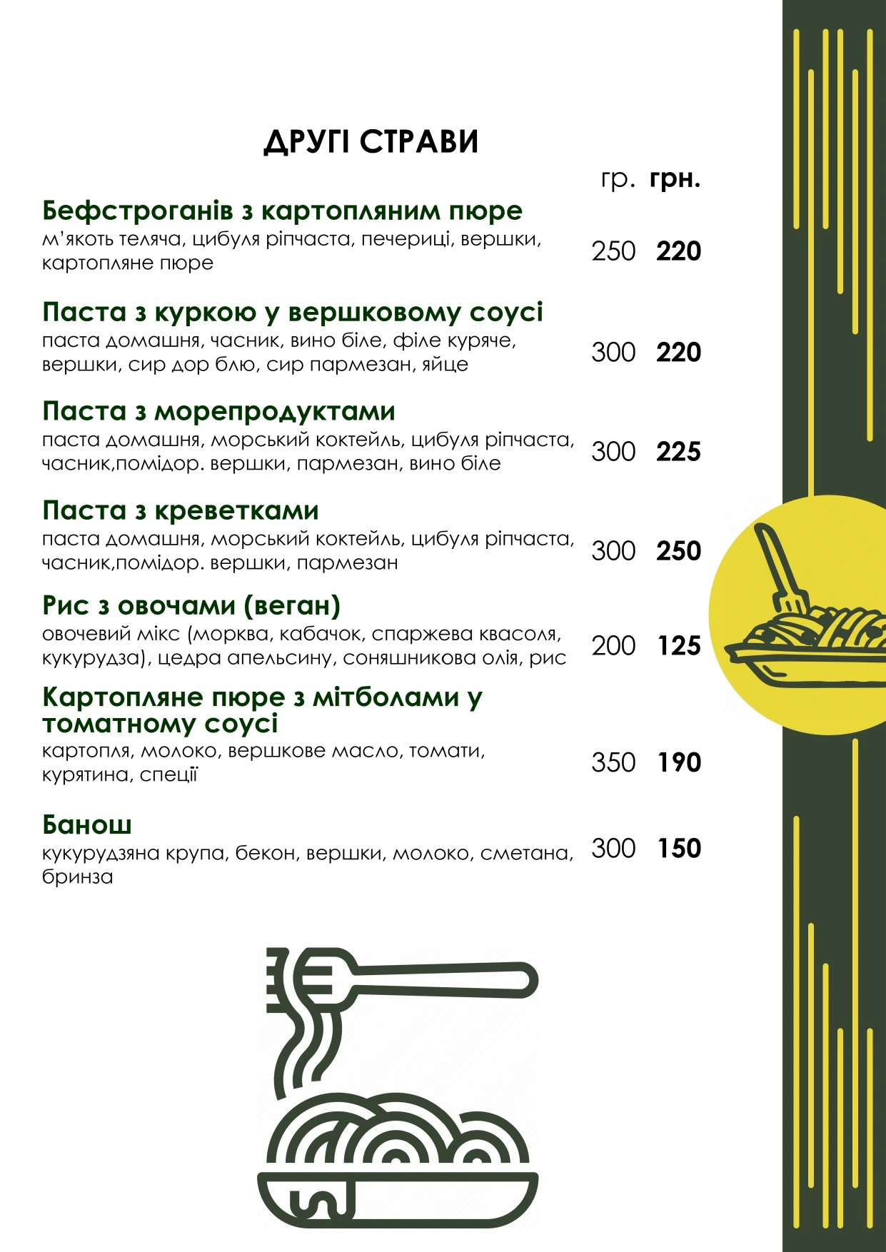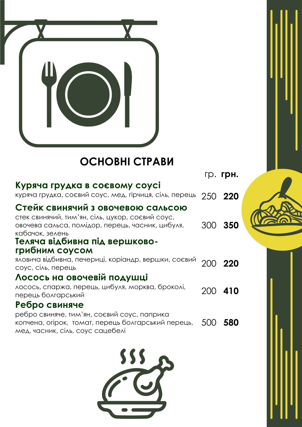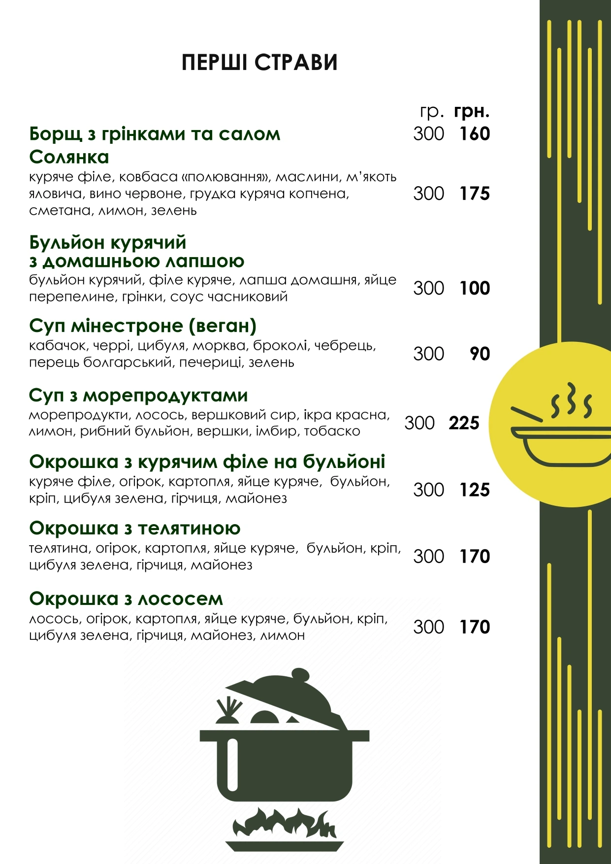Завітайте до нашого ресторану, щоб відчути нашу розслаблюючу атмосферу, знайти душевний спокій та насолодитися нашим різноманітним, смачним, вишуканим меню для гурманів. Широкий вибір гарнірів, других страв та закусок, а також безалкогольних та алкогольних напоїв створений для того, щоб порадувати ваші смакові рецептори!