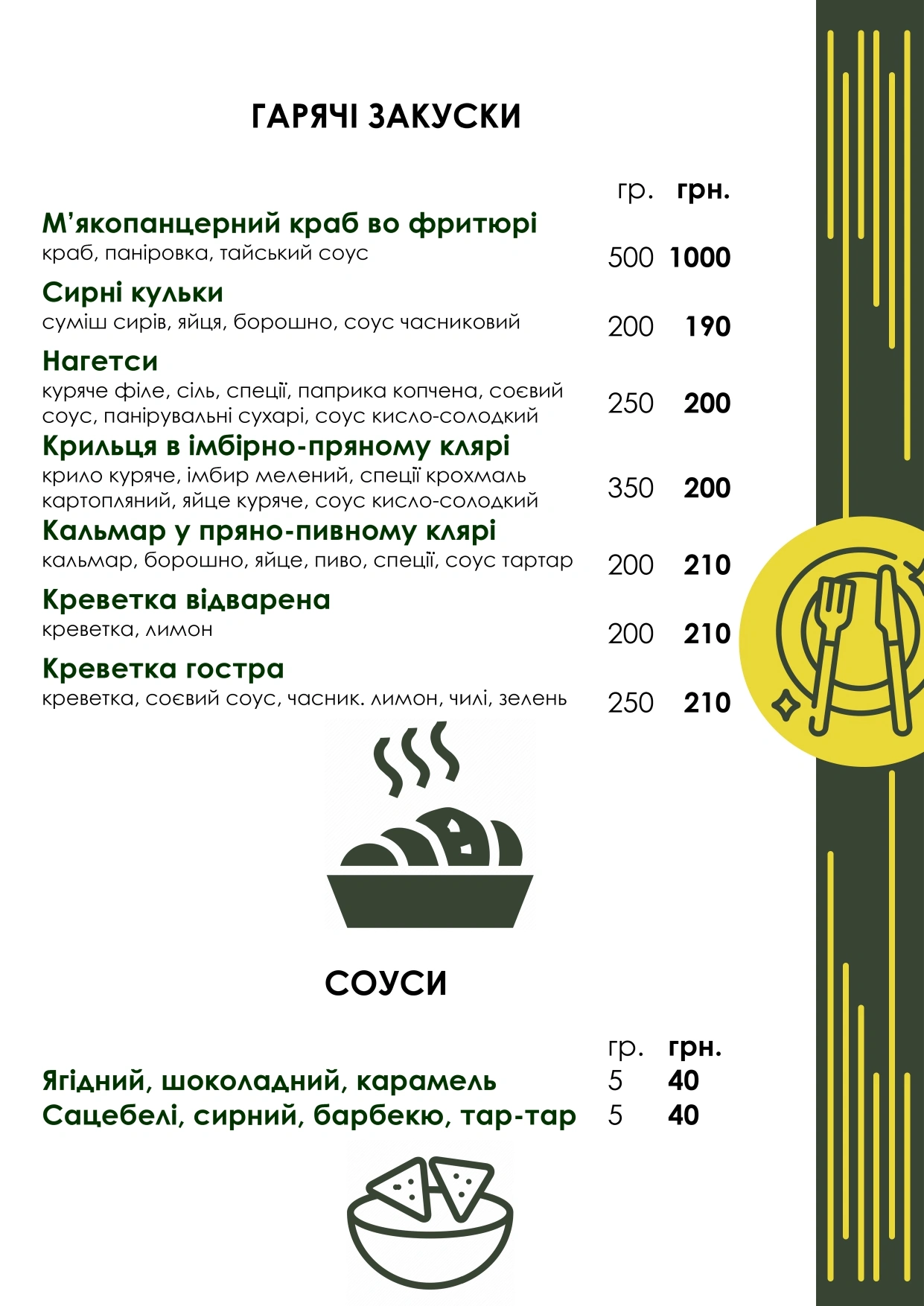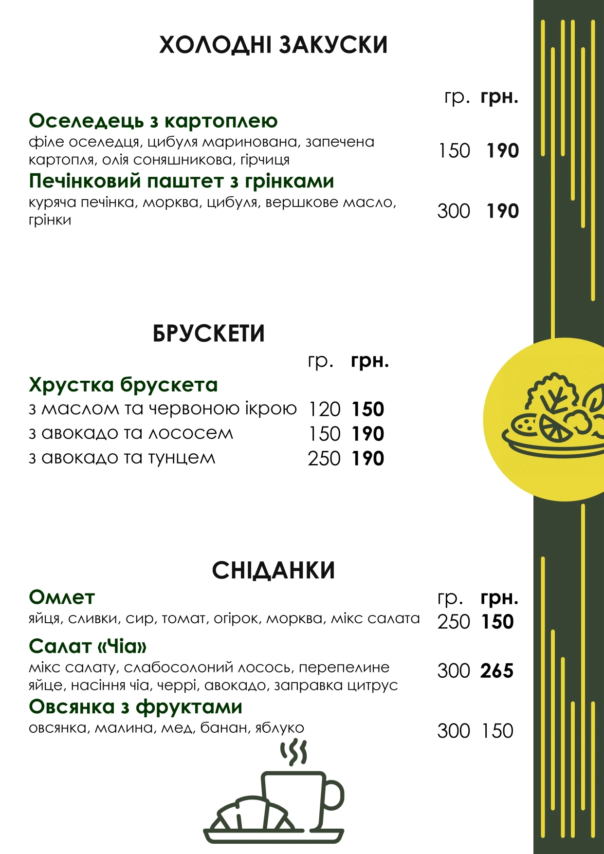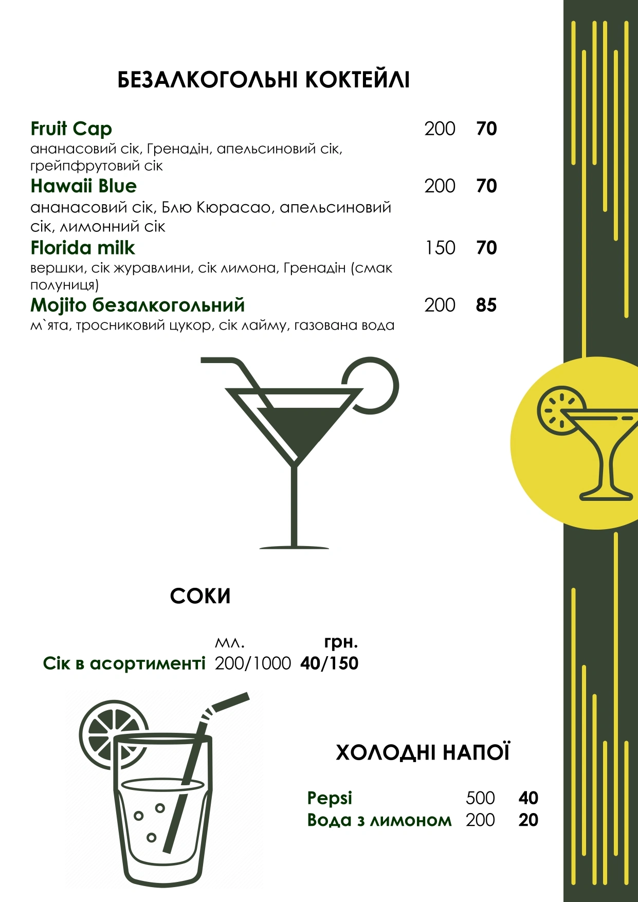 Завітайте до нашого ресторану, щоб відчути нашу розслаблюючу атмосферу, знайти душевний спокій та насолодитися нашим різноманітним, смачним, вишуканим меню для гурманів. Широкий вибір гарнірів, других страв та закусок, а також безалкогольних та алкогольних напоїв створений для того, щоб порадувати ваші смакові рецептори!